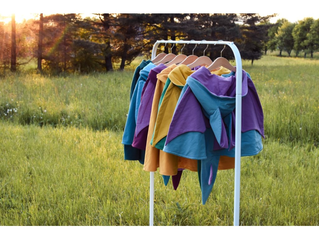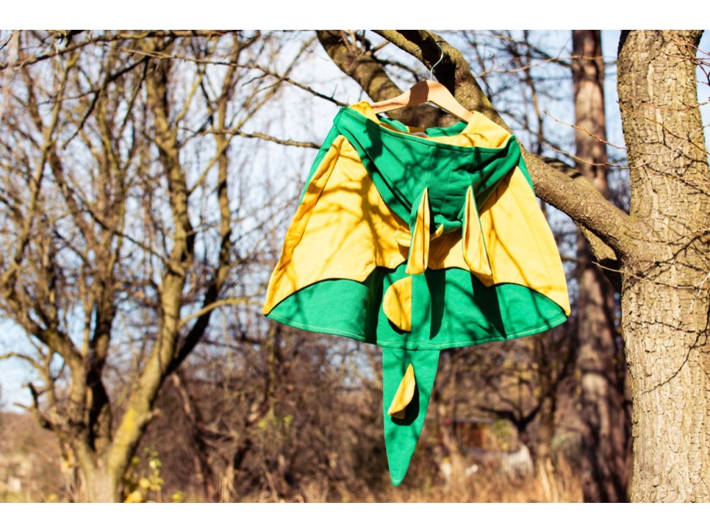 Plášť je ušitý ze dvou vrstev nepočesané teplákoviny (95 % bavlna, 5 % elastan). Má dračí uši, křídla, ocas a své jedinečné zbarvení. Je měkoučký, hřejivý a připravený na všechna dračí dobrodružství.